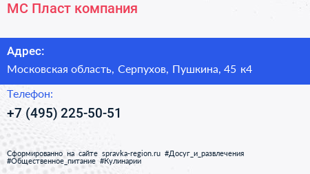 МС Пласт, компания по адресу Московская область, Серпухов, Пушкина, 45 к4 в дальнейшем Организация, размещена в следующих категориях: