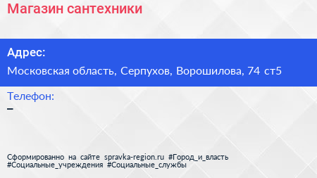 Магазин сантехники по адресу Московская область, Серпухов, Ворошилова, 74 ст5 в дальнейшем Организация, размещена в следующих категориях: