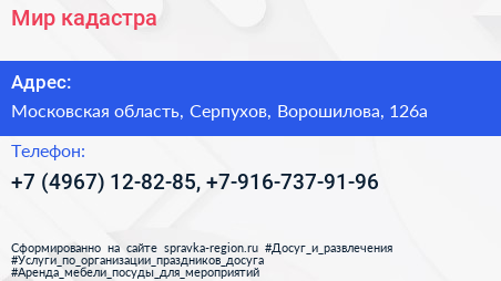 Мир кадастра по адресу Московская область, Серпухов, Ворошилова, 126а в дальнейшем Организация, размещена в следующих категориях: