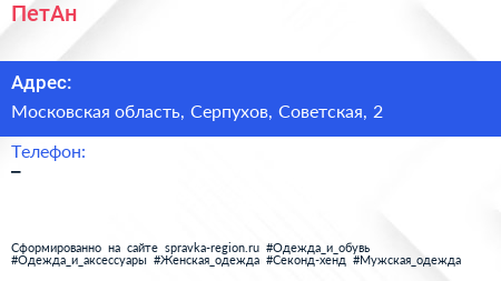 ПетАн по адресу Московская область, Серпухов, Советская, 2 в дальнейшем Организация, размещена в следующих категориях: