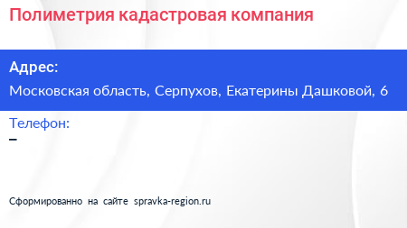 Полиметрия, кадастровая компания по адресу Московская область, Серпухов, Екатерины Дашковой, 6 в дальнейшем Организация, размещена в следующих категориях: