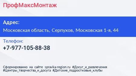 ПрофМаксМонтаж по адресу Московская область, Серпухов, Московская 1-я, 44 в дальнейшем Организация, размещена в следующих категориях: