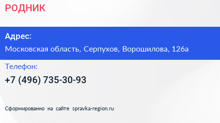 РОДНИК по адресу Московская область, Серпухов, Ворошилова, 126а в дальнейшем Организация, размещена в следующих категориях: