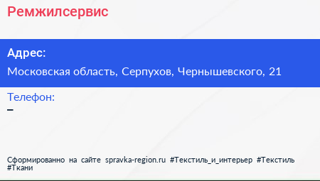 Ремжилсервис по адресу Московская область, Серпухов, Чернышевского, 21 в дальнейшем Организация, размещена в следующих категориях: