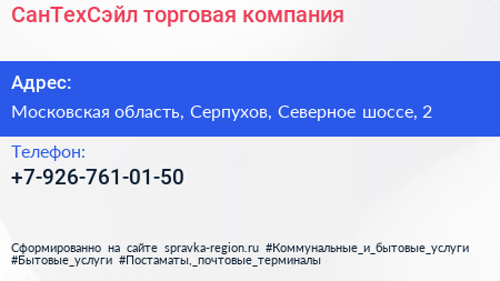 СанТехСэйл, торговая компания по адресу Московская область, Серпухов, Северное шоссе, 2 в дальнейшем Организация, размещена в следующих категориях: