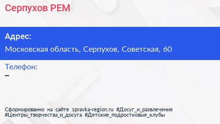 Серпухов РЕМ по адресу Московская область, Серпухов, Советская, 60 в дальнейшем Организация, размещена в следующих категориях: