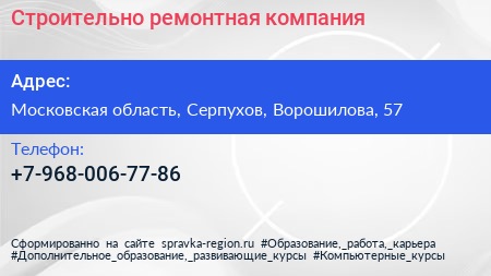 Строительно-ремонтная компания по адресу Московская область, Серпухов, Ворошилова, 57 в дальнейшем Организация, размещена в следующих категориях: