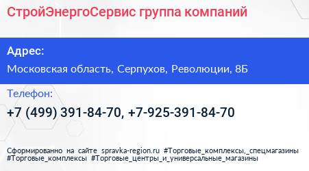 СтройЭнергоСервис, группа компаний по адресу Московская область, Серпухов, Революции, 8Б в дальнейшем Организация, размещена в следующих категориях: