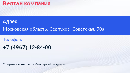 Велтэн, компания по адресу Московская область, Серпухов, Советская, 70а в дальнейшем Организация, размещена в следующих категориях: