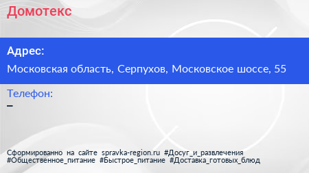 Домотекс по адресу Московская область, Серпухов, Московское шоссе, 55 в дальнейшем Организация, размещена в следующих категориях: