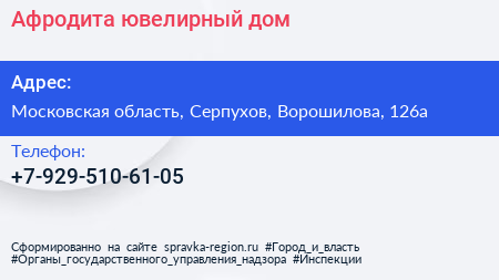 Афродита, ювелирный дом по адресу Московская область, Серпухов, Ворошилова, 126а в дальнейшем Организация, размещена в следующих категориях: