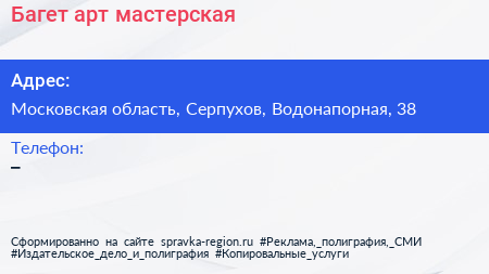 Багет-арт, мастерская по адресу Московская область, Серпухов, Водонапорная, 38 в дальнейшем Организация, размещена в следующих категориях: