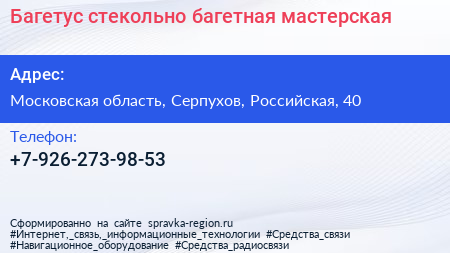 Багетус, стекольно-багетная мастерская по адресу Московская область, Серпухов, Российская, 40 в дальнейшем Организация, размещена в следующих категориях: