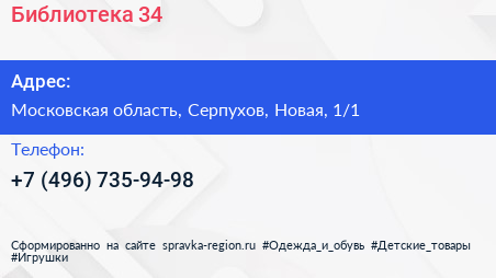 Библиотека №34 по адресу Московская область, Серпухов, Новая, 1/1 в дальнейшем Организация, размещена в следующих категориях: