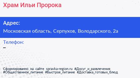 Храм Ильи Пророка по адресу Московская область, Серпухов, Володарского, 2а в дальнейшем Организация, размещена в следующих категориях: