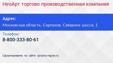 НеоАрт, торгово-производственная компания по адресу Московская область, Серпухов, Северное шоссе, 1 в дальнейшем Организация, размещена в следующих категориях: