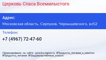 Церковь Спаса Всемилыстого по адресу Московская область, Серпухов, Чернышевского, вл52 в дальнейшем Организация, размещена в следующих категориях: