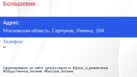 Большевик по адресу Московская область, Серпухов, Ленина, 104 в дальнейшем Организация, размещена в следующих категориях: