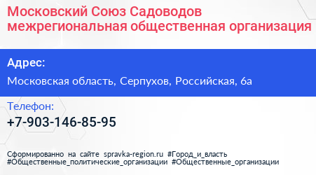 Московский Союз Садоводов, межрегиональная общественная организация по адресу Московская область, Серпухов, Российская, 6а в дальнейшем Организация, размещена в следующих категориях: