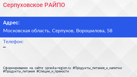 Серпуховское РАЙПО по адресу Московская область, Серпухов, Ворошилова, 58 в дальнейшем Организация, размещена в следующих категориях: