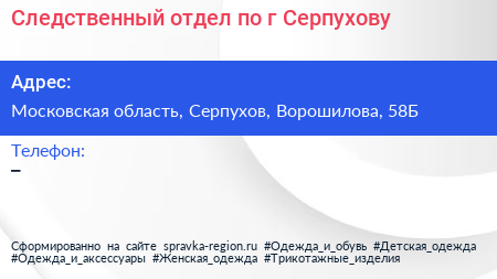 Следственный отдел по г. Серпухову по адресу Московская область, Серпухов, Ворошилова, 58Б в дальнейшем Организация, размещена в следующих категориях: