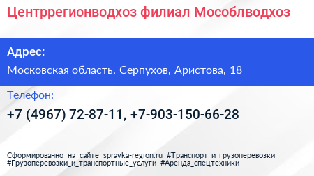 Центррегионводхоз, филиал Мособлводхоз по адресу Московская область, Серпухов, Аристова, 18 в дальнейшем Организация, размещена в следующих категориях: