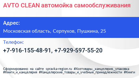 AVTO-CLEAN, автомойка самообслуживания по адресу Московская область, Серпухов, Пушкина, 25 в дальнейшем Организация, размещена в следующих категориях: