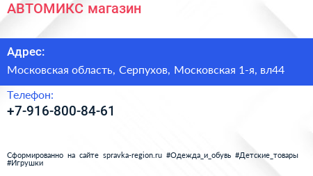АВТОМИКС, магазин по адресу Московская область, Серпухов, Московская 1-я, вл44 в дальнейшем Организация, размещена в следующих категориях: