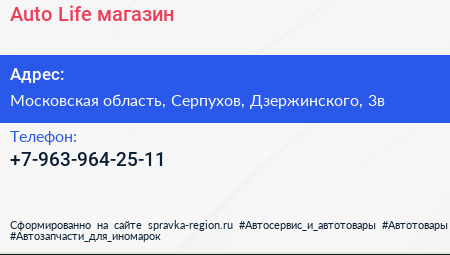 Auto-Life, магазин по адресу Московская область, Серпухов, Дзержинского, 3в в дальнейшем Организация, размещена в следующих категориях: