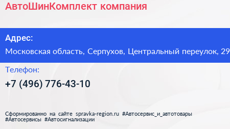 АвтоШинКомплект, компания по адресу Московская область, Серпухов, Центральный переулок, 29 в дальнейшем Организация, размещена в следующих категориях: