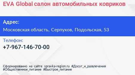 EVA Global, салон автомобильных ковриков по адресу Московская область, Серпухов, Подольская, 53 в дальнейшем Организация, размещена в следующих категориях:
