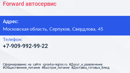 Forward, автосервис по адресу Московская область, Серпухов, Свердлова, 45 в дальнейшем Организация, размещена в следующих категориях: