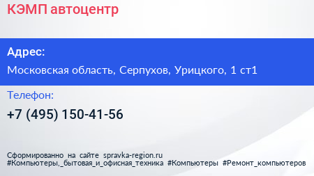 КЭМП, автоцентр по адресу Московская область, Серпухов, Урицкого, 1 ст1 в дальнейшем Организация, размещена в следующих категориях: