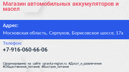 Магазин автомобильных аккумуляторов и масел по адресу Московская область, Серпухов, Борисовское шоссе, 17а в дальнейшем Организация, размещена в следующих категориях:
