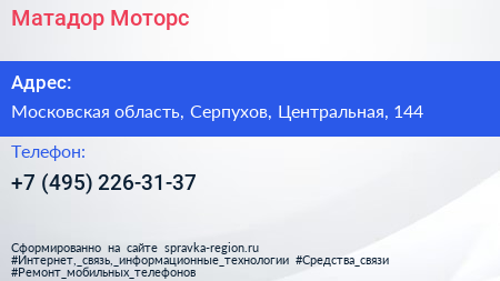 Матадор Моторс по адресу Московская область, Серпухов, Центральная, 144 в дальнейшем Организация, размещена в следующих категориях: