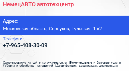 НемецАВТО, автотехцентр по адресу Московская область, Серпухов, Тульская, 1 к2 в дальнейшем Организация, размещена в следующих категориях: