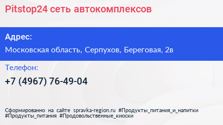 Pitstop24, сеть автокомплексов по адресу Московская область, Серпухов, Береговая, 2в в дальнейшем Организация, размещена в следующих категориях: