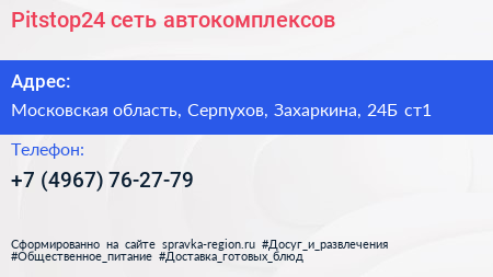 Pitstop24, сеть автокомплексов по адресу Московская область, Серпухов, Захаркина, 24Б ст1 в дальнейшем Организация, размещена в следующих категориях: