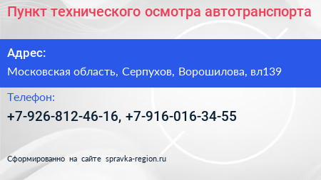 Пункт технического осмотра автотранспорта по адресу Московская область, Серпухов, Ворошилова, вл139 в дальнейшем Организация, размещена в следующих категориях: