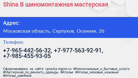 Shina-B, шиномонтажная мастерская по адресу Московская область, Серпухов, Осенняя, 26 в дальнейшем Организация, размещена в следующих категориях:
