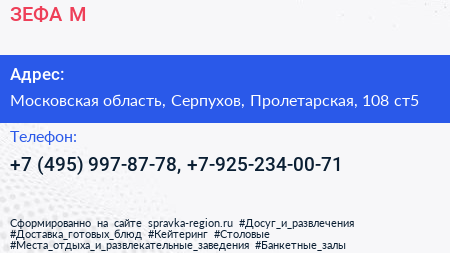 ЗЕФА-М по адресу Московская область, Серпухов, Пролетарская, 108 ст5 в дальнейшем Организация, размещена в следующих категориях: