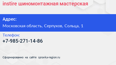 instire, шиномонтажная мастерская по адресу Московская область, Серпухов, Сольца, 1 в дальнейшем Организация, размещена в следующих категориях: