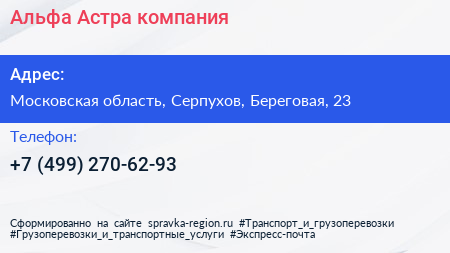 Альфа Астра, компания по адресу Московская область, Серпухов, Береговая, 23 в дальнейшем Организация, размещена в следующих категориях: