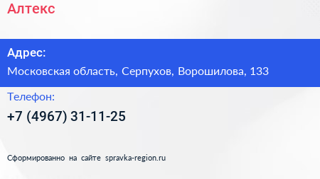 Алтекс по адресу Московская область, Серпухов, Ворошилова, 133 в дальнейшем Организация, размещена в следующих категориях: