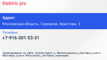 Elektric-pro по адресу Московская область, Серпухов, Аристова, 1 в дальнейшем Организация, размещена в следующих категориях: