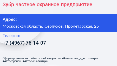 Зубр, частное охранное предприятие по адресу Московская область, Серпухов, Пролетарская, 25 в дальнейшем Организация, размещена в следующих категориях: