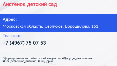 Аистёнок, детский сад по адресу Московская область, Серпухов, Ворошилова, 161 в дальнейшем Организация, размещена в следующих категориях: