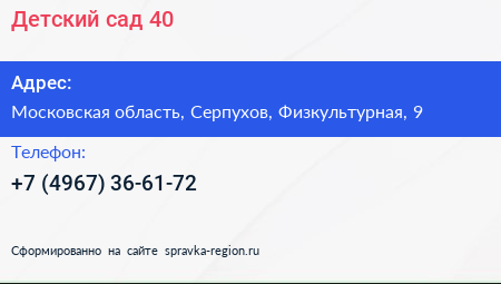 Детский сад №40 по адресу Московская область, Серпухов, Физкультурная, 9 в дальнейшем Организация, размещена в следующих категориях: