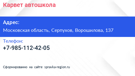 Карвет, автошкола по адресу Московская область, Серпухов, Ворошилова, 137 в дальнейшем Организация, размещена в следующих категориях: