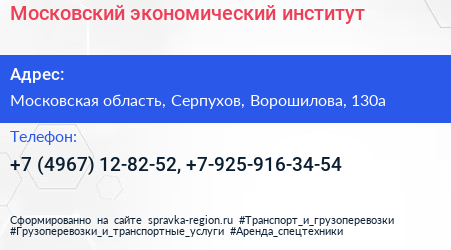 Московский экономический институт по адресу Московская область, Серпухов, Ворошилова, 130а в дальнейшем Организация, размещена в следующих категориях: